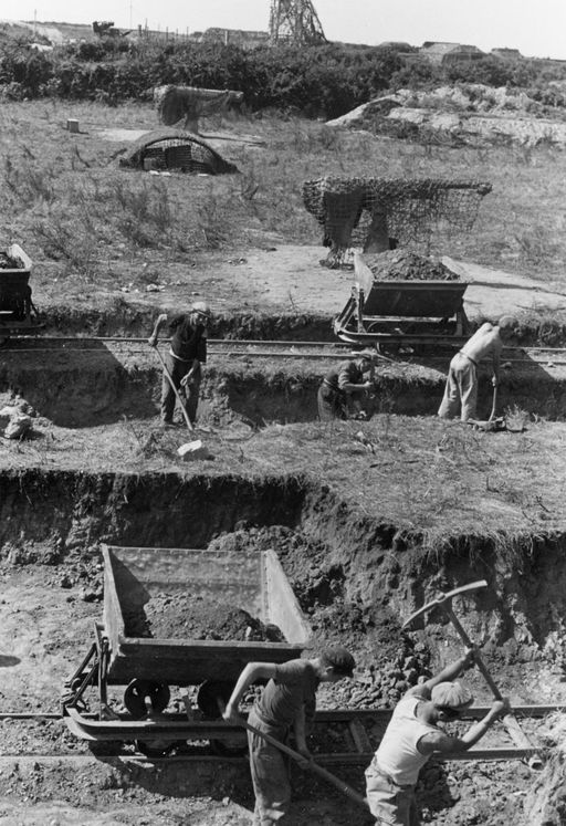 Vue du chantier de la batterie Graf Spee : ouvriers piochant et pelletant de la terre le long de deux voies ferrées pour chariot Decauville servant à évacuer la terre, fin 1940. Les deux canons de 75 mm dissimulés sous des filets sont destinés à la défense du site. A l'arrière-plan, un miradorImmatriculation