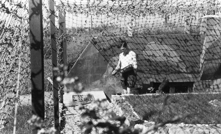 Vue de la vie quotidienne de la garnison de la batterie Graf Spee : soldat nettoyant ses bottes, novembre 1941 ? (image de propagande)Immatriculation
