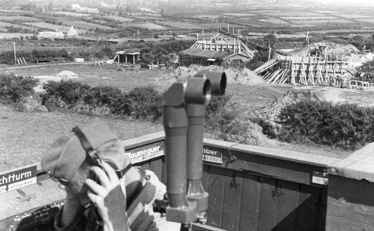 Vue générale du chantier de la batterie Graf Spee depuis le sommet de l'un des miradors, fin 1940 ? Au premier plan, soldat avec casque radiophonique disposant de jumelles périscopiques binoculaires. Des inscriptions donnent des repères aux alentours du miradorImmatriculation
