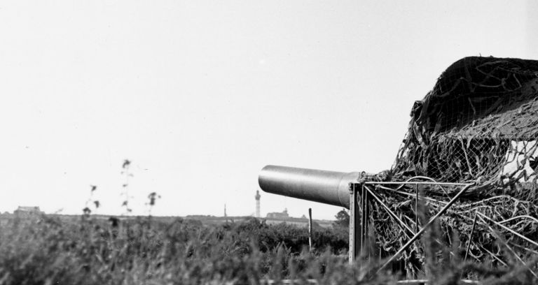Vue de l'un des quatre canons de 28 cm de la batterie Graf Spee (image de propagande). En arrière-plan, le phare de Saint-MathieuImmatriculation