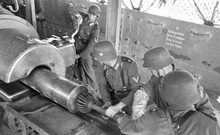 Vue de la vie quotidienne de la garnison de la batterie Graf Spee : exercice de tir (image de propagande). Le projectile a été chargé par la culasse ; la gargousse est introduite dans le tubeImmatriculation