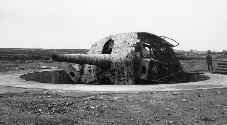 Vue de l'un des canons de 28 cm après les combats de septembre 1944Immatriculation