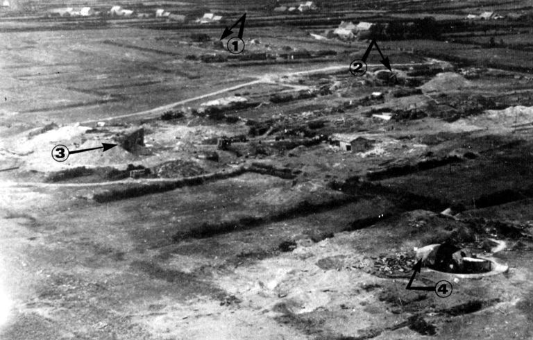 Vue aérienne oblique de la batterie Graf Spee après les combats de septembre 1944 : les quatre canons de 28 cm sont signalés par des flèchesImmatriculation