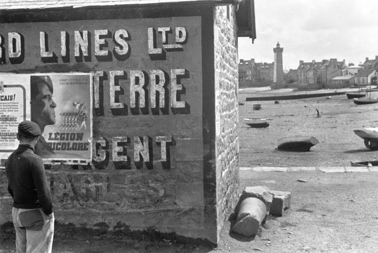 Vue d'affiches de propagande pour la Légion tricolore collées dans le port de Roscoff, 1942 (collection particulière). En arrière-plan, le phare de Roscoff. Il s'agit d'une photographie de propagandeImmatriculation