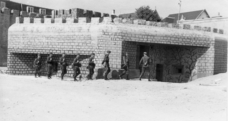 Vue d'une patrouille allemande devant le bunker - casemate (collection particulière). On notera le camouflage particulièrement bien soigné du bunker : merlons et créneaux de la dalle de couverture, faux appareillage et plantes grimpantes en peinture...Immatriculation