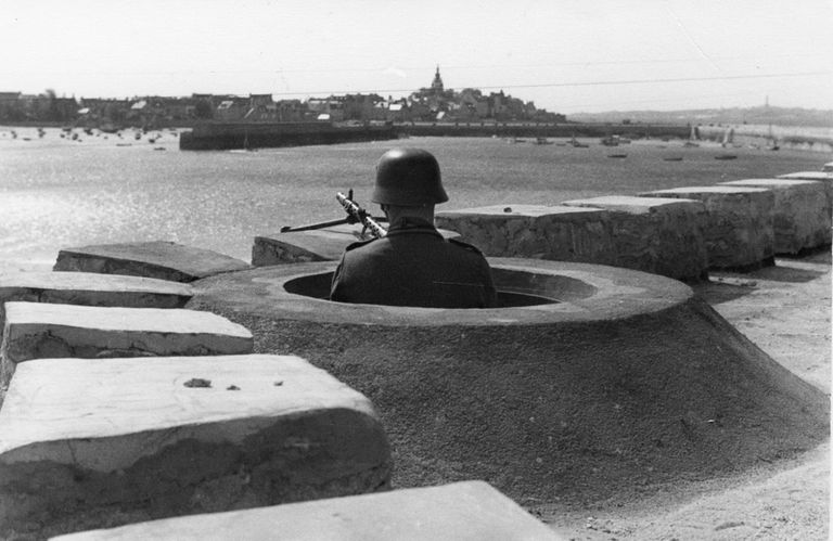 Vue d'une sentinelle allemande dans son poste d'observation et de tir dit Tobruk-Stand au-dessus du bunker (collection particulière). En arrière plan, le port de RoscoffImmatriculation