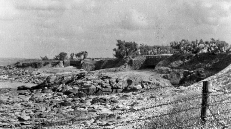 Vue de la côte orientée vers le nord-est : on aperçoit les deux bunkers - casemates camouflées (collection particulière). Au premier plan, l'un des réseaux de barbelés. Il s'agit d'une photographie de propagandeImmatriculation