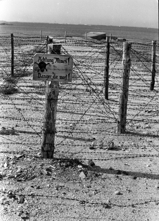 Vue de l'un des nombreux champs de mines entourés de barbelé avec sa signalétique Achtung Minen ! Danger de mort ! (collection particulière). Il s'agit d'une photographie de propagandeImmatriculation