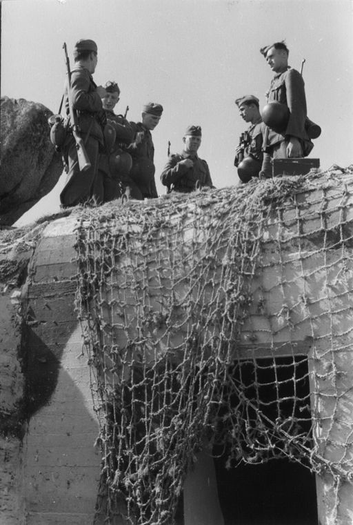 Vue d'un groupe de cinq soldats sur la dalle de couverture du bunker nommé Felsen (collection particulière). Surmonté d'une tourelle de char Renault FT, le bunker est camouflé par des peintures et un filet... Il s'agit d'une photographie de propagandeImmatriculation