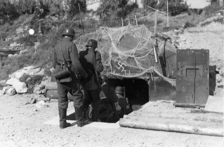 Vue de l'un des bunkers avec des soldats qui y rentrent avec leurs fusils Mauser... (collection particulière). Son entrée est surmontée d'une croix gammée nazie et de l'inscription Bunker Johann. Il s'agit d'une photographie de propagandeImmatriculation