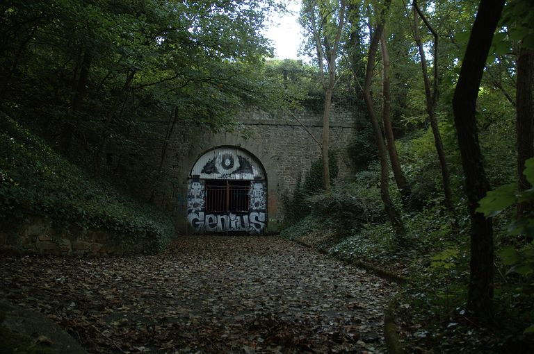 Vue de l'entrée du tunnel d'Heurtebise traversant le front bastionné de l'Harteloire dit Nouvelle enceinte (construite en 1848)Immatriculation