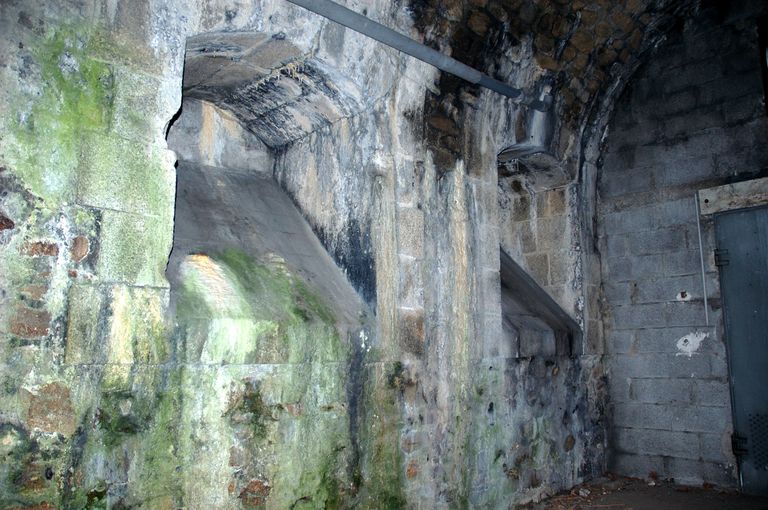 Vue de l'entrée du tunnel d'Heurtebise traversant le front bastionné de l'Harteloire dit Nouvelle enceinte (construite en 1848) : intérieur du sas, deux créneaux de fusillade disposés à gauche en entrantImmatriculation