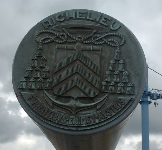 Vue du monument commémoratif : canon de 380 mm. du bâtiment de ligne de 35 000 tonnes Richelieu. RICHELIEU FVENTIBVS-EMINET-AVSTRISImmatriculation