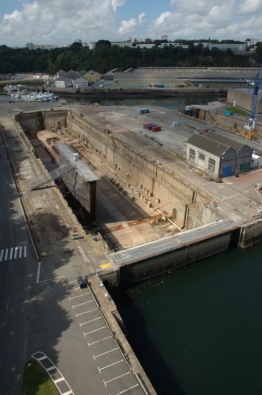 Vue d'ensemble des formes de construction, bassins de radoub actuellement bassins n° 4, 6 et 7 depuis le pont de l'Harteloire : bassin n° 4, porte de l'écluseImmatriculation
