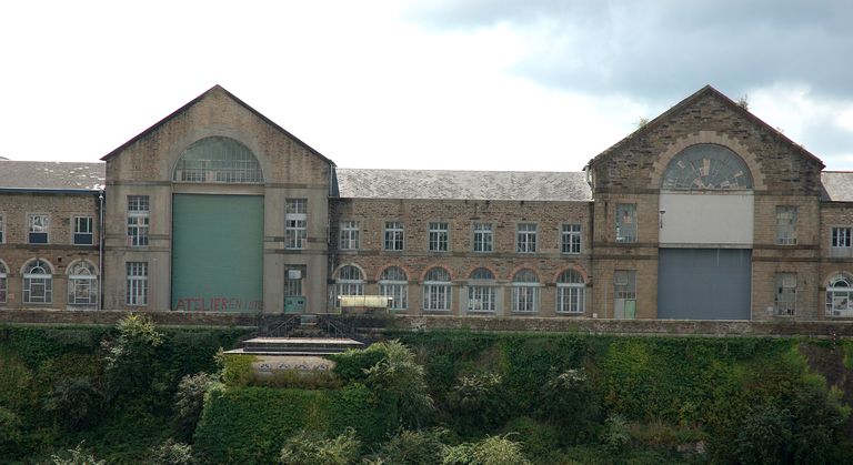 Vue des ateliers des Capucins (Incription : Atelier en lutte). Les latrines en contrebas des ateliers sont surnommées "la pagode" en raison de leur formeImmatriculation