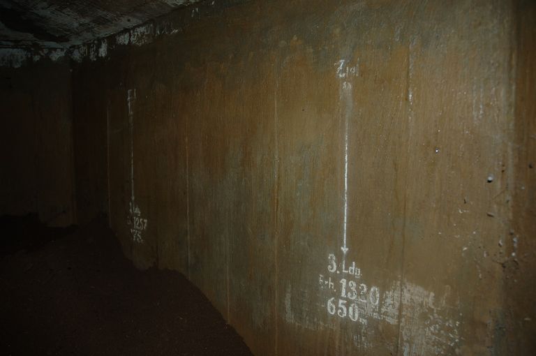 Vue d'un ensemble fortifié de la Presqu'île de Kermorvan constitué d'un Tobrouk pour mortier de 80 mm, tranchée bétonnée et abri : marquage allemandImmatriculation