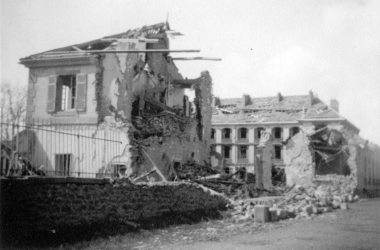 Vue de la caserne du Polygone après les combats de la Libération, septembre 1944Immatriculation