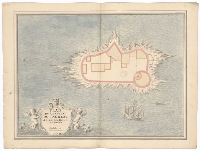 Plan du château du Taureau, vers 1670. (Cartouche : deux jeunes tritons ; Figuration de vaisseau et de barque)Immatriculation