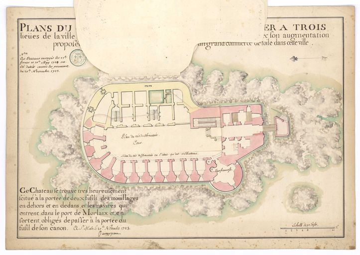 Collection Nivart. MS144_265. Château du Taureau. Plan aux trois étages du chasteau du Taureau. Sign. Garangeau. 20 novembre 1723. Plan, support papier, 0,490 x 0,334 mètre, 1er quart 18e siècle, 20 novembre 1723.