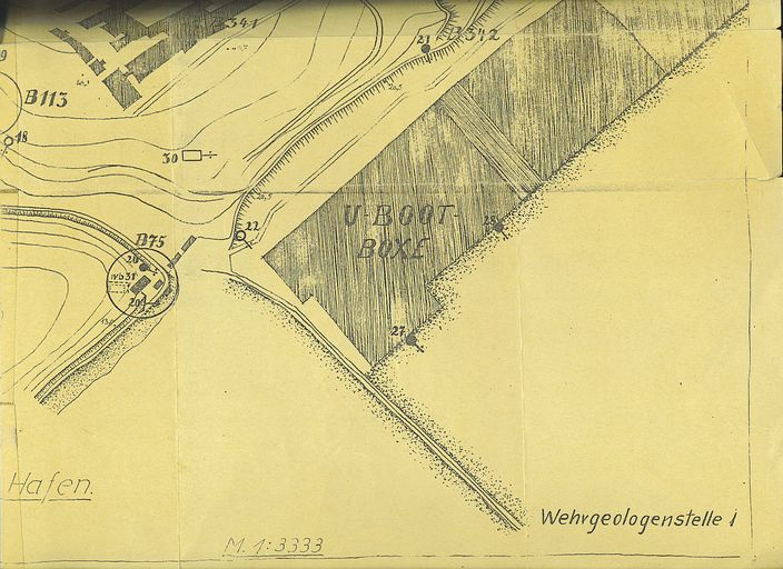 Plan allemand des ensembles fortifiés école navale et port des sous-marins : B 75, 113-119, 341-342 (Stützpunkt Marineschule ou U-Boot Hafen. Wehrgeologenstelle)Immatriculation