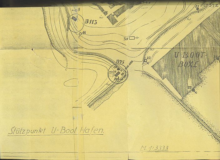 Plan allemand des ensembles fortifiés école navale et port des sous-marins : B 75, 113-119, 341-342 (Stützpunkt Marineschule ou U-Boot Hafen. Wehrgeologenstelle)Immatriculation