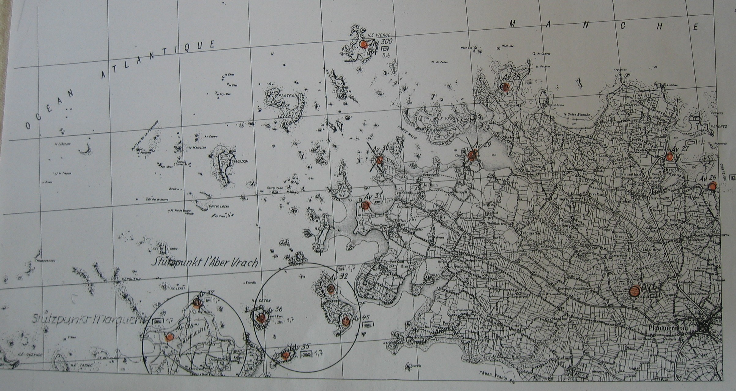 Carte allemande des ensembles fortifiés du groupe défensif côtier de Lesneven / Aber Wrach codé Av (Av 26 - 32 ; Av 35 - 38 ; Av 45 ; Av 63 : Plouguerneau, station de pompage ; Av 300 : Ile Vierge)Immatriculation