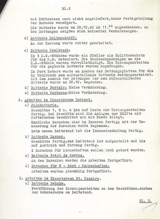 Courrier du Festungs-Pionierstabes 28 concernant les batteries de Brest (Graf Spee, Holtzendorff, Toulbroch, Portzic et Kerbonn) Lorient (Jadebatterie, Larmor et Pointe de Gavres) et Saint-Nazaire (Behnke), Brest, 29 octobre 1940Immatriculation