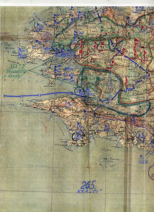 Carte allemande du secteur de défense côtier B (K.V.Gr. Lesneven codé Av ; K.V.Gr. St Renan codé Re ; K.V.Gr. Brest codé B ; K.V.Gr. Crozon codé Cr) et C1 (K.V.Gr. Quimper codé Qu ; K.V.Gr. Anse du Pouldu ; etc.) montrant les régimentsImmatriculation