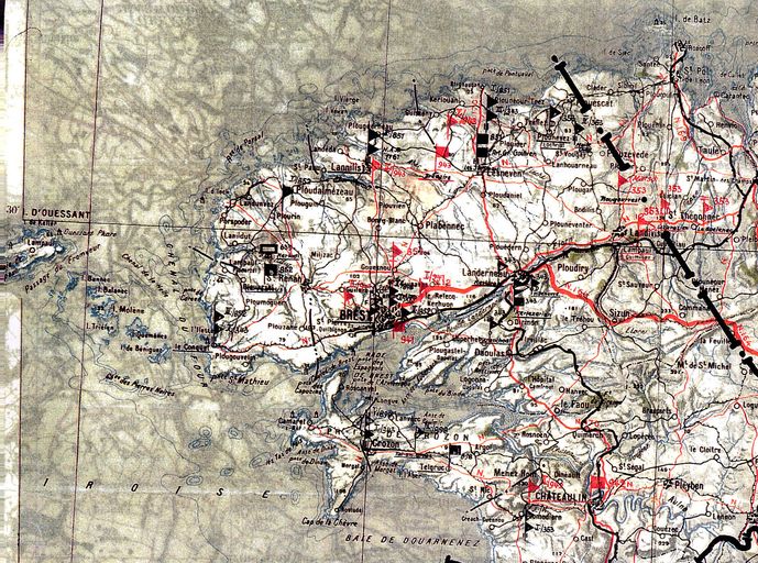 Carte allemande du secteur de défense côtier B (K.V.Gr. Lesneven codé Av ; K.V.Gr. St Renan codé Re ; K.V.Gr. Brest codé B ; K.V.Gr. Crozon codé Cr) montrant l'implantation des régimentsImmatriculation