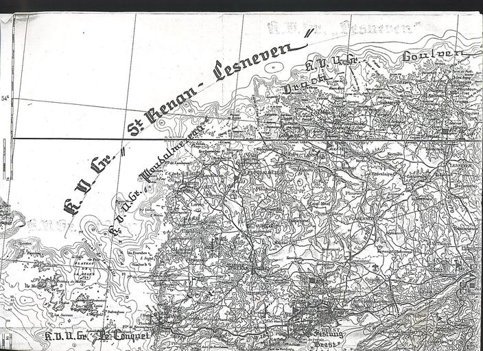 Carte allemande du secteur de défense côtier B (K.V.Gr. Lesneven codé Av ; K.V.Gr. St Renan codé Re ; K.V.Gr. Brest codé B ; K.V.Gr. Crozon codé Cr) montrant l'implantation des régimentsImmatriculation