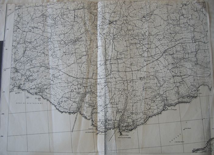 Carte allemande des ensembles fortifiés du groupe défensif côtier de Saint-Renan codé Re (Re 67 - 69 ; Re 78 ; Re 84 - 86 ; Re 310 ; Re 312 - 313) et de la Festung Brest codée B (B 318 - 322)Immatriculation