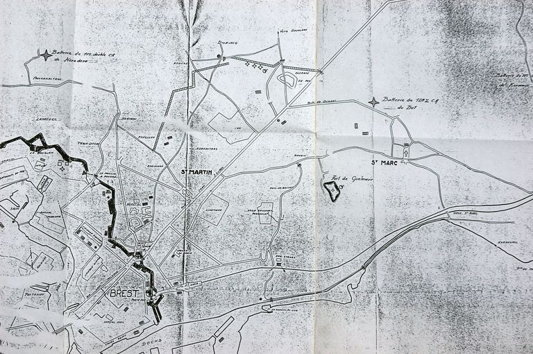 Extrait du plan de la place forte de Brest à l'issue de la Seconde Guerre Mondiale : "ouvrages de défense ex-allemands" (extrait du rapport Pinczon du Sel, 1947-1948)Immatriculation