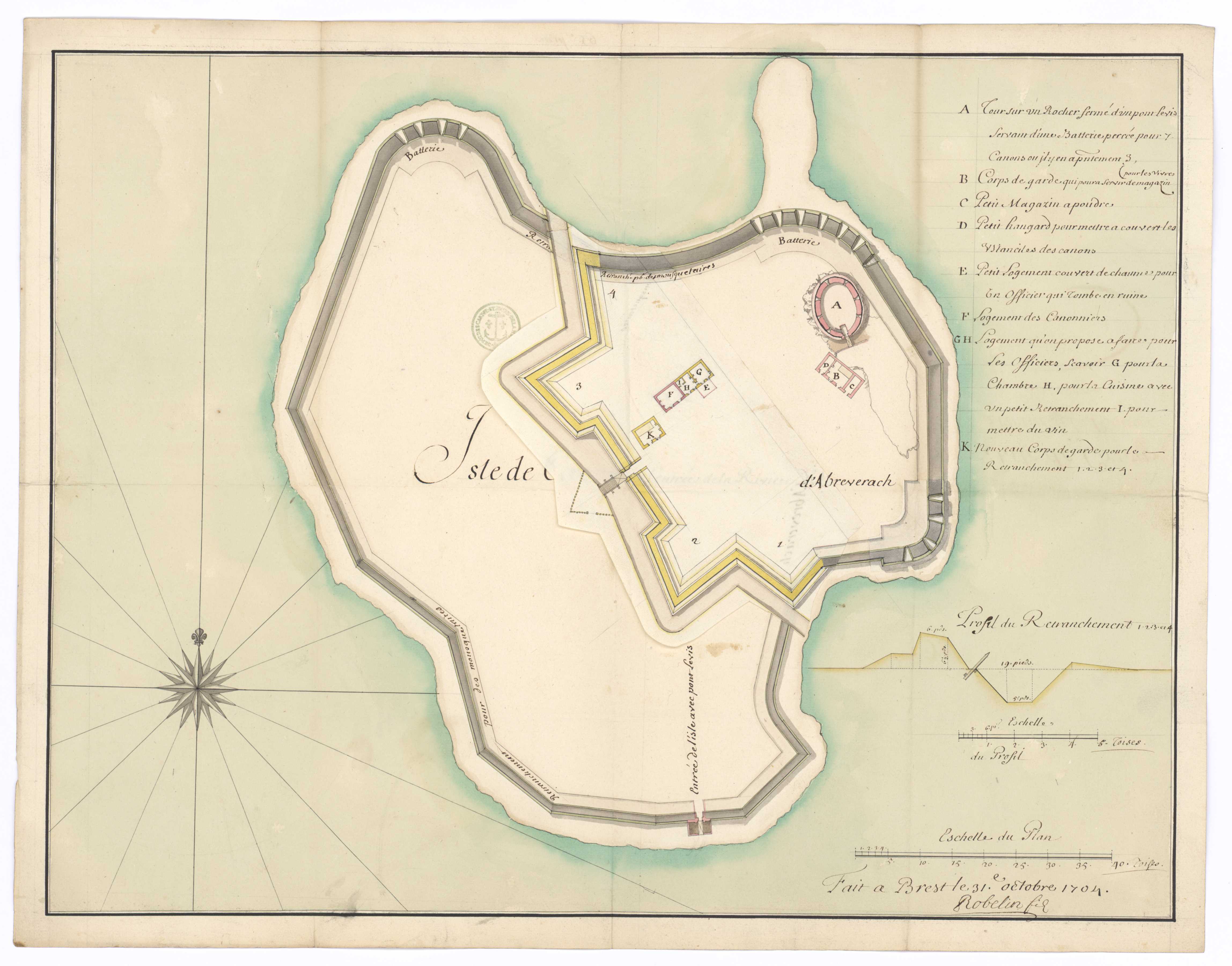 Collection Nivart. MS144_226. Rivière d'Aber-Wrac´h. Ile de Cézon. Plan de l'île et de ses retranchements avec projet de transformation. Profil du nouveau retranchement. Sign. Robelin fis. 31 octobre 1704. Plan, support papier, 0,572 x 0,441 mètre, 1er quart 18e siècle, 31 octobre 1704.