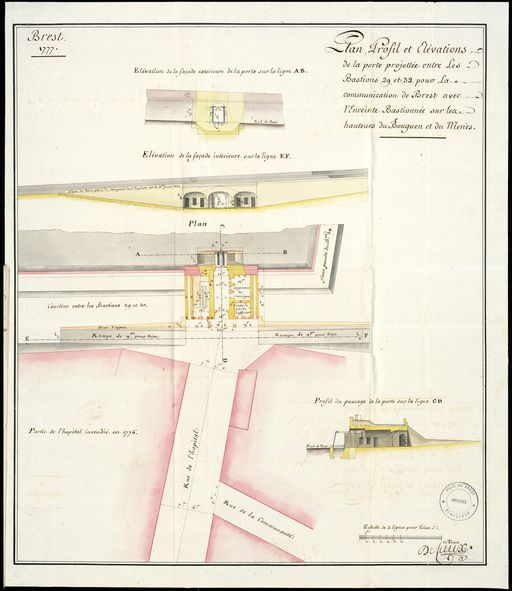 Ouvrages extérieurs de Brest, 1777 : plan, profil et élévations de la porte projetée entre les bastions 29 et 32 pour la communication de Brest avec l'enceinte bastionnée sur les hauteurs du Bougen et du Menès, par de CauxImmatriculation