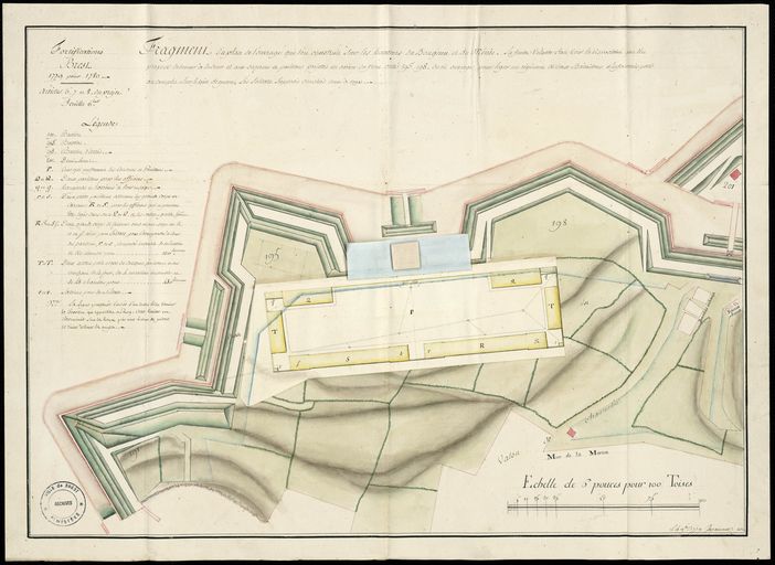 Fortifications de Brest, 1779 pour 1780 : plan partiel de l'ouvrage construit sur les hauteurs du Bouguen et du Menès, projet de casernes, cour et pavillons pour loger un régiment de deux bataillons d'infanterie. Le 4 novembre 1779, par De CauxImmatriculation
