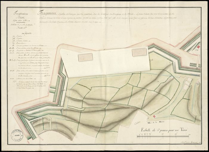Fortifications de Brest, 1779 pour 1780 : plan partiel de l'ouvrage construit sur les hauteurs du Bouguen et du Menès, projet de casernes, cour et pavillons pour loger un régiment de deux bataillons d'infanterie. Le 4 novembre 1779, par De CauxImmatriculation