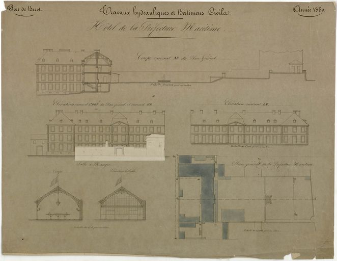 Port de Brest, travaux hydrauliques et bâtiments civils, 1858 : plan général, coupes et élévations de l'Hôtel de Préfecture Maritime (ancien hôtel Saint-Pierre situé rue de Siam)Immatriculation