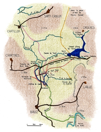 Schéma du réseau des eaux de Pont Péan vers 1755. Les zones en bleu foncé représentent les reseaux artificiels: la détournement au nord, le canal d'adduction et l'étang de la mine au sudImmatriculation