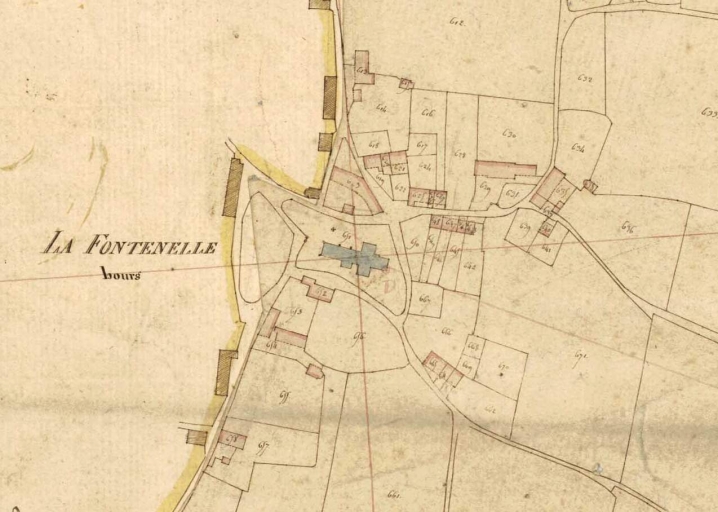 La Fontenelle. Section B du Bourg, 1ère feuille, par Jouchet du Ranquin, géomètre. Papier, encre, aquarelle, [1823], échelle 1 : 2500 e. (A.D. Ille-et-Vilaine).