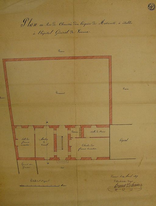 Plan au rez-de-chaussée d'un hospice de maternité à établir à l'hôpital général par Philippe Brunet-Debaines, 1817. AM Vannes 3M202.Immatriculation