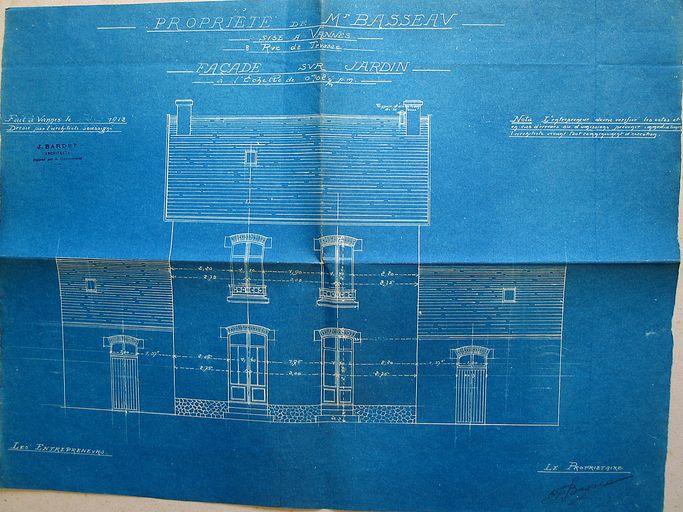 Elévation sur jardin par Jules Bardet, 1912. AM Vannes 5 I 162.Immatriculation