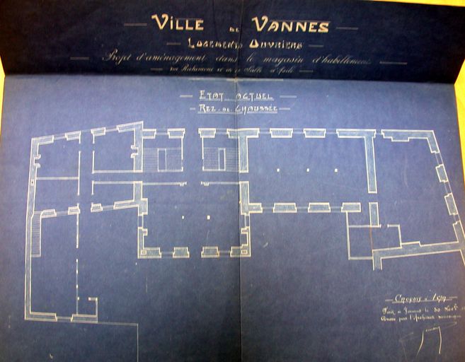 Aménagements de logements ouvriers dans les réserves militaires, par Gemain. Rez-de-chaussée, état actuel, 16 septembre 1921. AM Vannes 1 M 197.Immatriculation