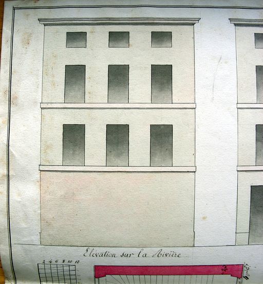 Moulin à papier à établir rue du Roulage pour M. Le Vanier, plans et élévations par Brunet-Debaines, sd (1821), détail : élévation sur la rivière. AD Morbihan, 5M 230.Immatriculation