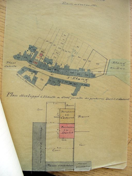 Demande Dorlot Cadoret, charcutiers, d'autorisation de conserver une porcherie. Extrait du plan cadastral de 1844, section K3, 1897. AD Morbihan, 5M 230.Immatriculation