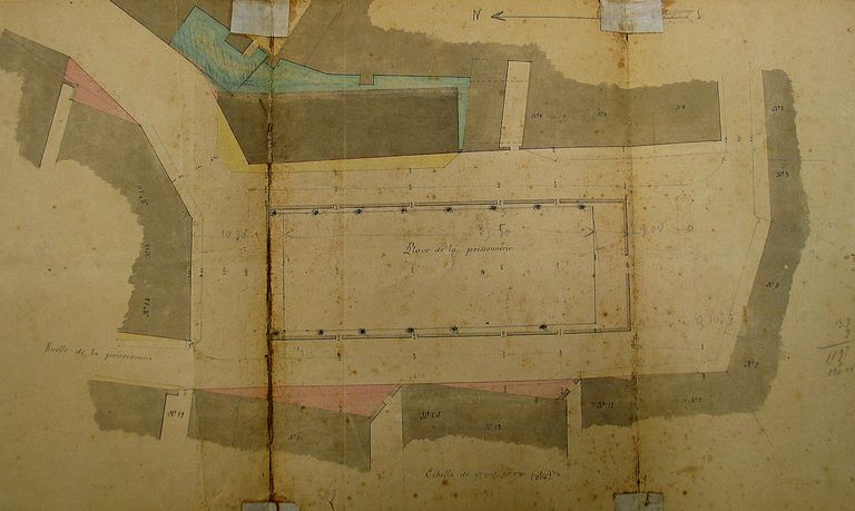 Plan de nivellement de la place de la Poissonnerie par de Lamarzelle, 12 août 1879. AM Vannes 1M197.Immatriculation