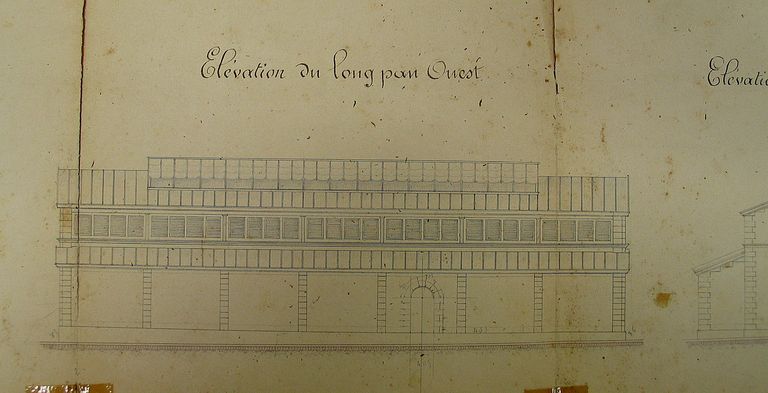 Elévation du long pan ouest par de Lamarzelle, 12 août 1879. AM Vannes 1M197.Immatriculation