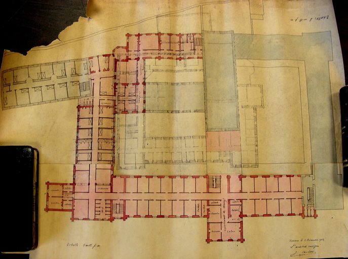 Projet d'agrandissement du Grand Séminaire par J. Caubert de Cléry, 1912 : plan du 1er étage, variante avec avancé façade est. Archives de l'Evêché de Vannes Y5.Immatriculation