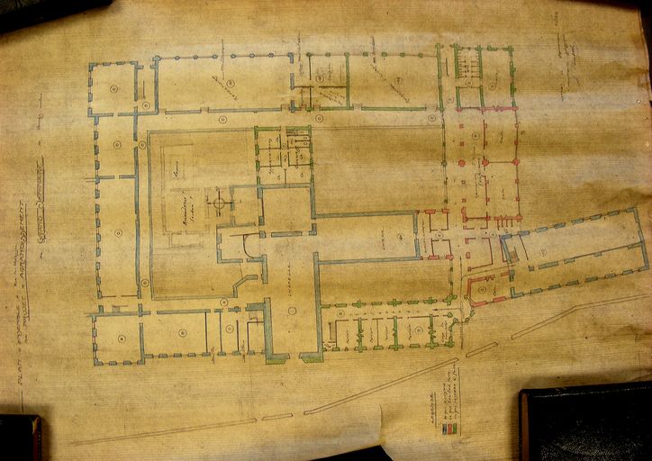 Plan d'ensemble du projet d'agrandissement du Grand Séminaire par J. Caubert de Cléry : plan du rez-de-chaussée, 1924. Archives de l'Evêché de Vannes Y5.Immatriculation