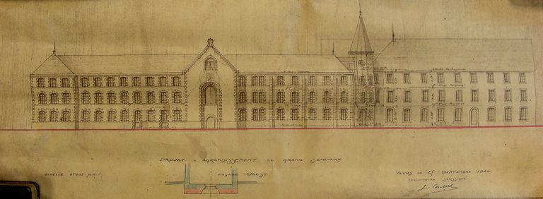 Projet d'agrandissement du Grand Séminaire par J. Caubert de Cléry, 1924 : élévation façade ouest. Archives de l'Evêché de Vannes Y5.Immatriculation