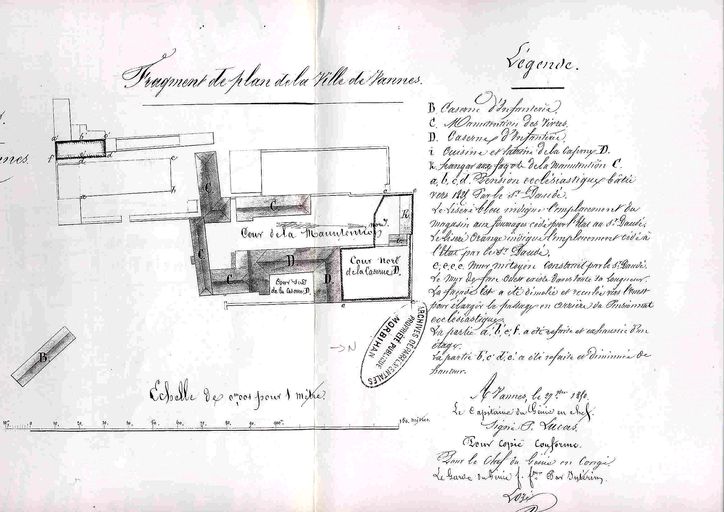 Plan de la caserne dressé lors de l'échange de terrains entre l'Etat et les héritiers Daudé, vers 1850 ; Genie militaire, direction de Brest, place de Vannes. AD Morbihan R 1356.Immatriculation